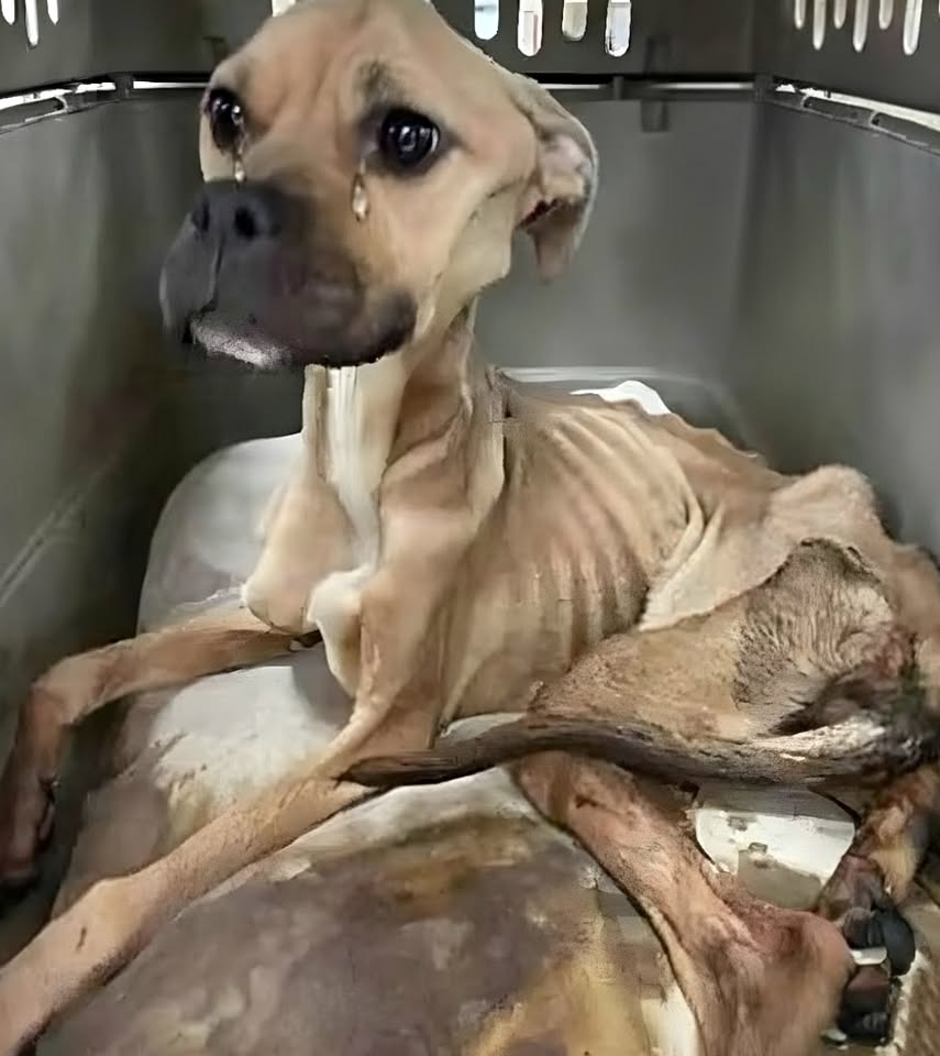 When rescuers first carried him inside, no one in the room could understand how this fragile, broken creature was still clinging to life. His body was nothing more than skin pulled tightly over protruding bones, each rib showing as if it might tear through at any moment. Every shallow breath seemed like a final attempt, a quiet battle his weakened frame could barely fight. His legs trembled uncontrollably, unable to support even the smallest movement, forcing him to curl into himself on a dirty, torn blanket that had clearly been his only comfort for far too long.